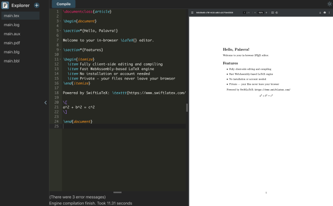 Palavra is a simple proof-of-concept LaTeX editor that runs entirely in the browser — no backend required. It’s built using SwiftLaTeX, a powerful WebAssembly project that enables in-browser LaTeX compilation.